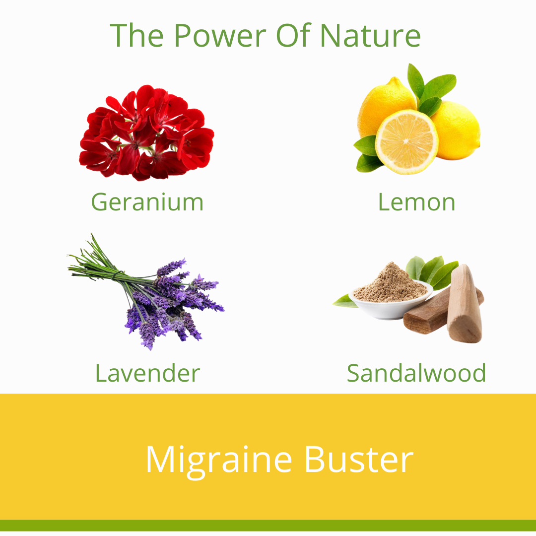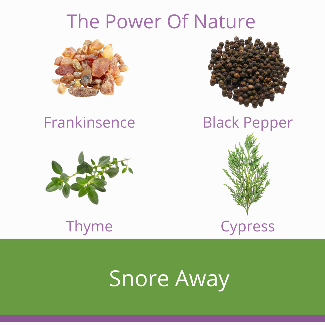 Snore Away: Piper Nigrum (Black Pepper) Seed Oil, Thymus vulgaris (Thyme) leaf oil, Cupressus sempervirens and Olibanum, Simmondsia Chinensis (Jojoba) Seed Oil. Migraine Buster: Pelargonium Graveolens Oil,  Santalum Album (sandalwood) oil, Salvia Sclarea (clary oil), Jasminum Officinale (Jasmine) Extract, Lavandula angustifolia (lavender) oil, Citrus Medica Limonum (lemon) peel oil, Achillea Millefolium oil, Simmondsia Chinensis (Jojoba) Seed Oil Breathe Free: Eucalyptus Globulus Leaf Oil , Lavandula Angustifolia (Lavender) Oil , Citrus Medica Limonum (Lemon) Peel Oil , Olibanum , Thymus vulgaris (Thyme) leaf oil, Ravensara Aromatica Oil and Pinus sylvestris, Simmondsia Chinensis (Jojoba) Seed Oil