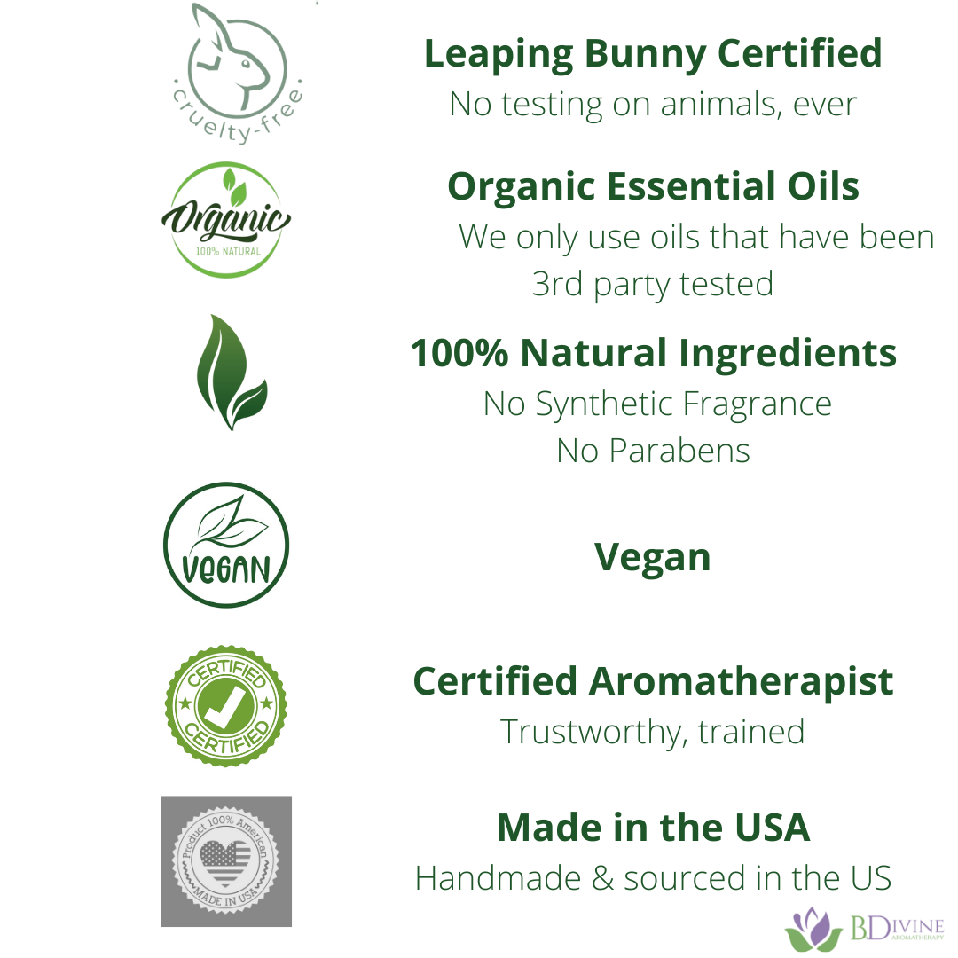 Organic essential oils| 100% Natural Ingredients | Gluten-Free| Vegan|  Nut Free| Leaping Bunny Certified | Paraben & Sulfate Free