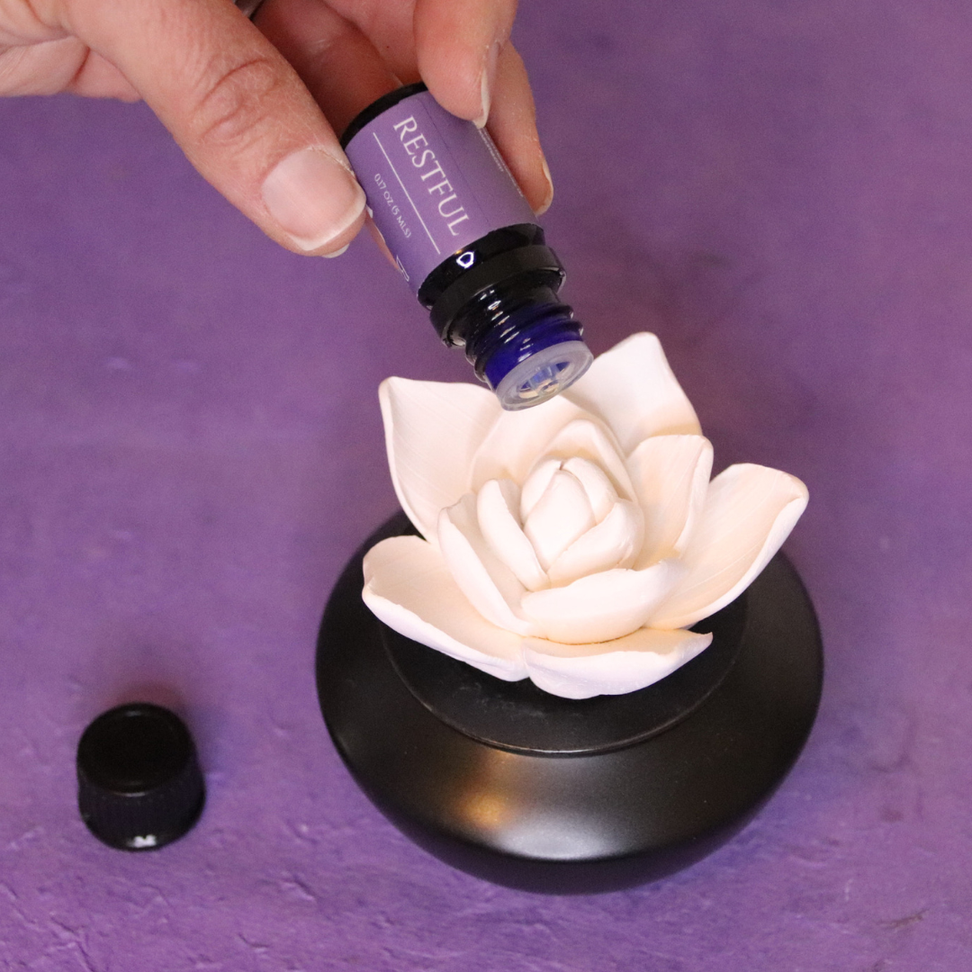 Use our Restful Essential Oil Diffuser Blend in your car, workspace, bathroom, or bedroom to cultivate a peaceful environment that supports relaxation and emotional wellness.