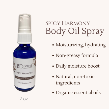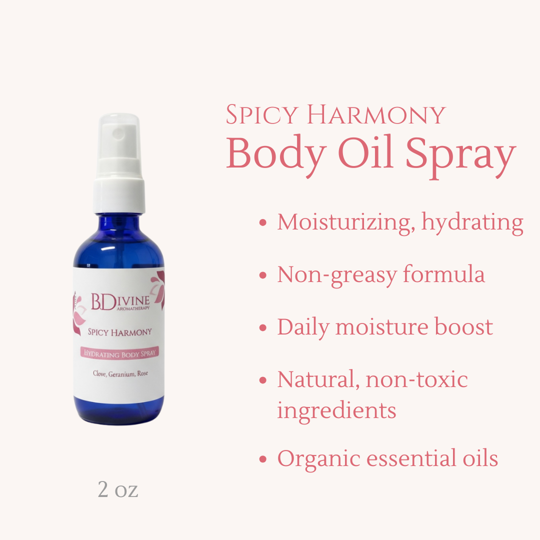 Spicy Harmony Hydrating Body Spray – A sophisticated blend of clove, geranium, and rose essential oils in a refreshing body spray that hydrates and balances the senses for an aromatic experience like no other.