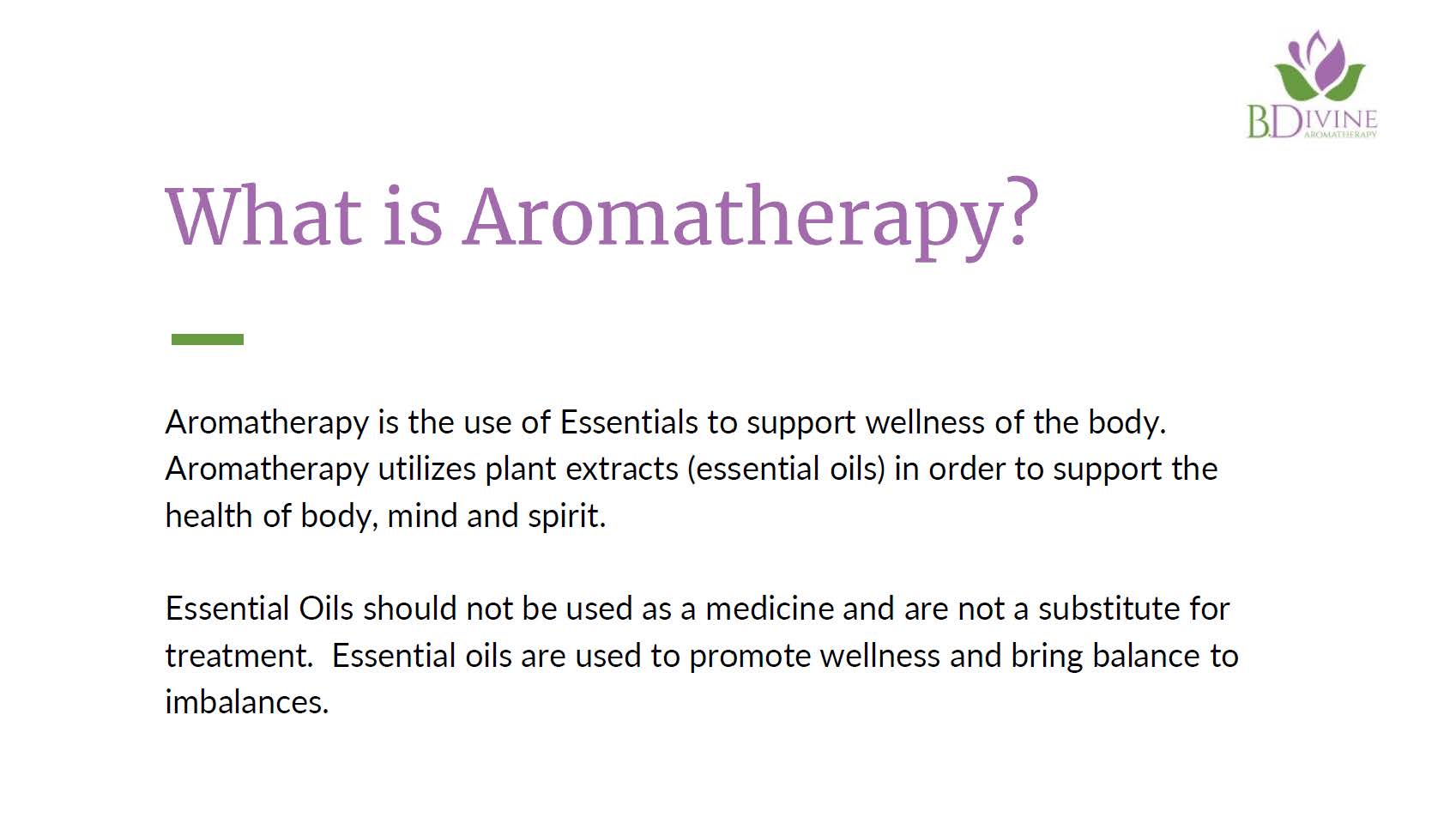 B. Divine also believes that education and safety when using essential oils are very important. There is a lot of information floating around, and it can be challenging to understand what is correct. As a certified aromatherapist, one of my top priorities is to give you a product that has been safely formulated and provide you with information about the oils you are using.